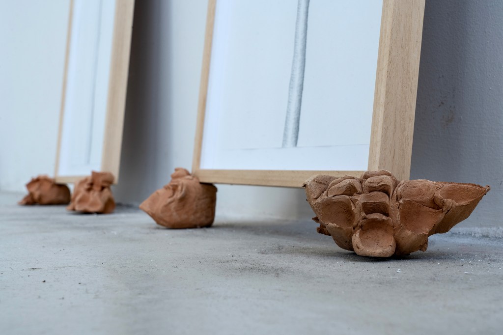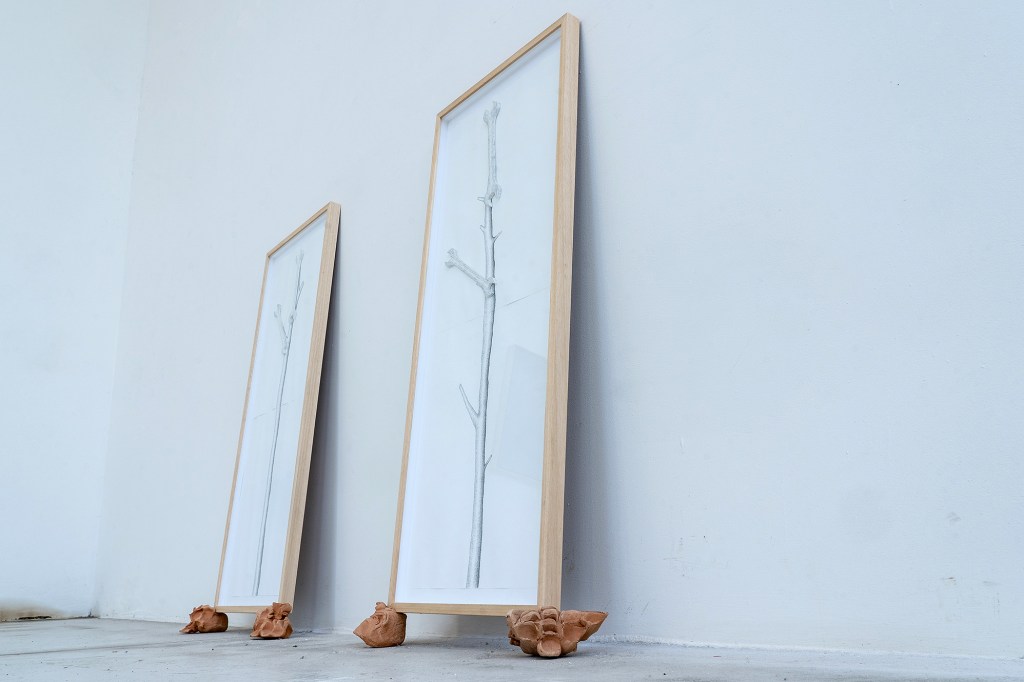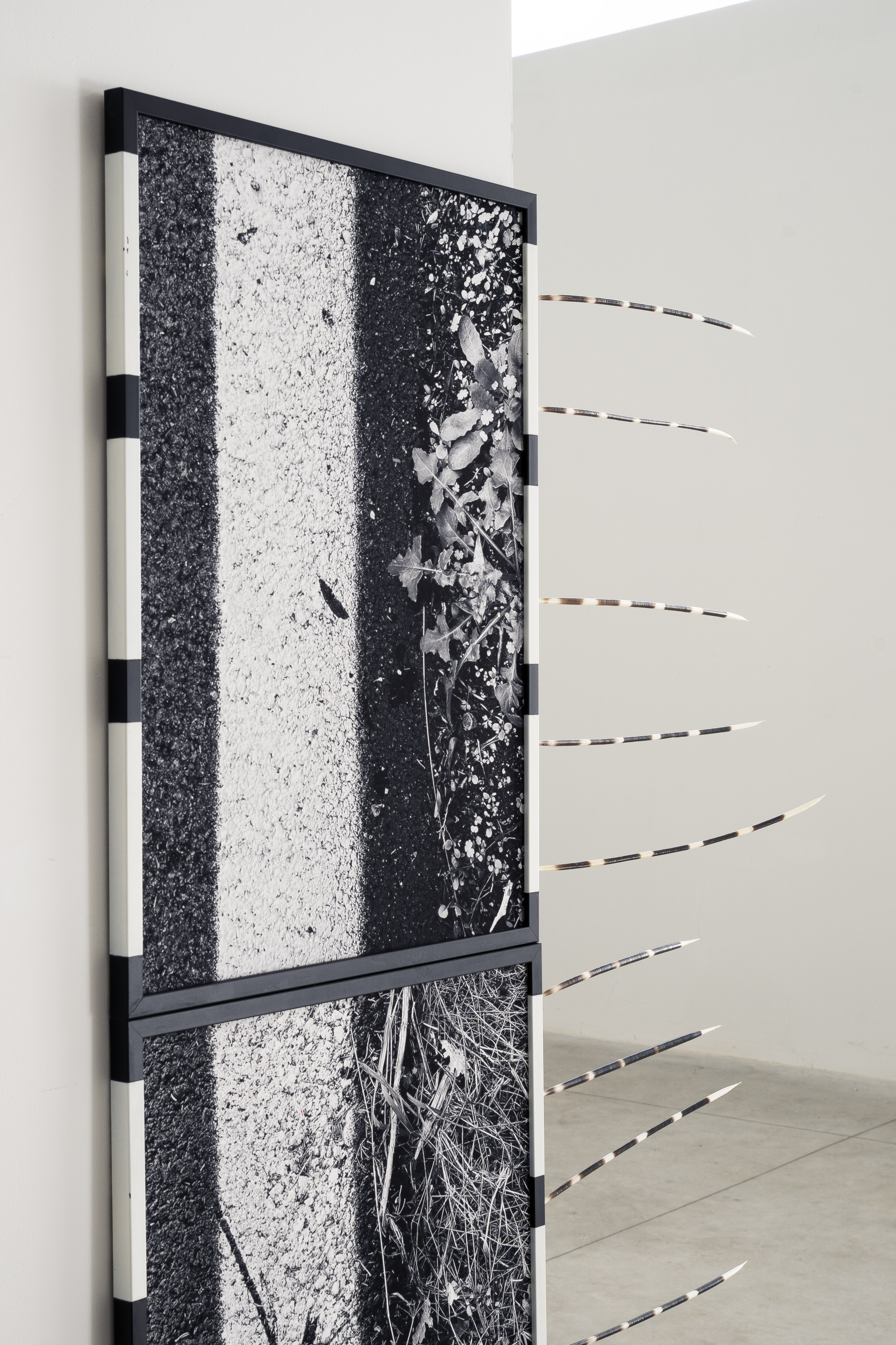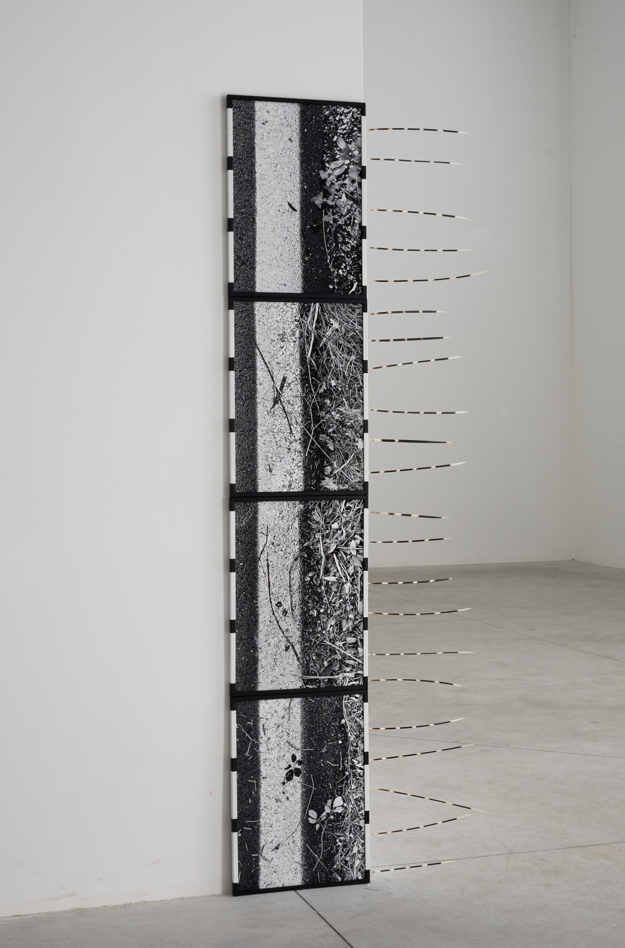 Marco Degl’Innocenti, RELAZIONI OCCASIONALI, 2023. Quattro stampe fotografiche su carta Hahnemuhle, cornice/scultura 43,5cmx 53,5cm variabili, penne di istrice. Foto Veronica Citi.