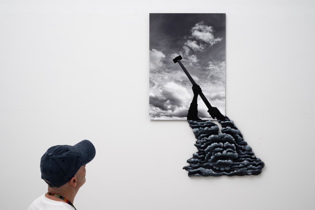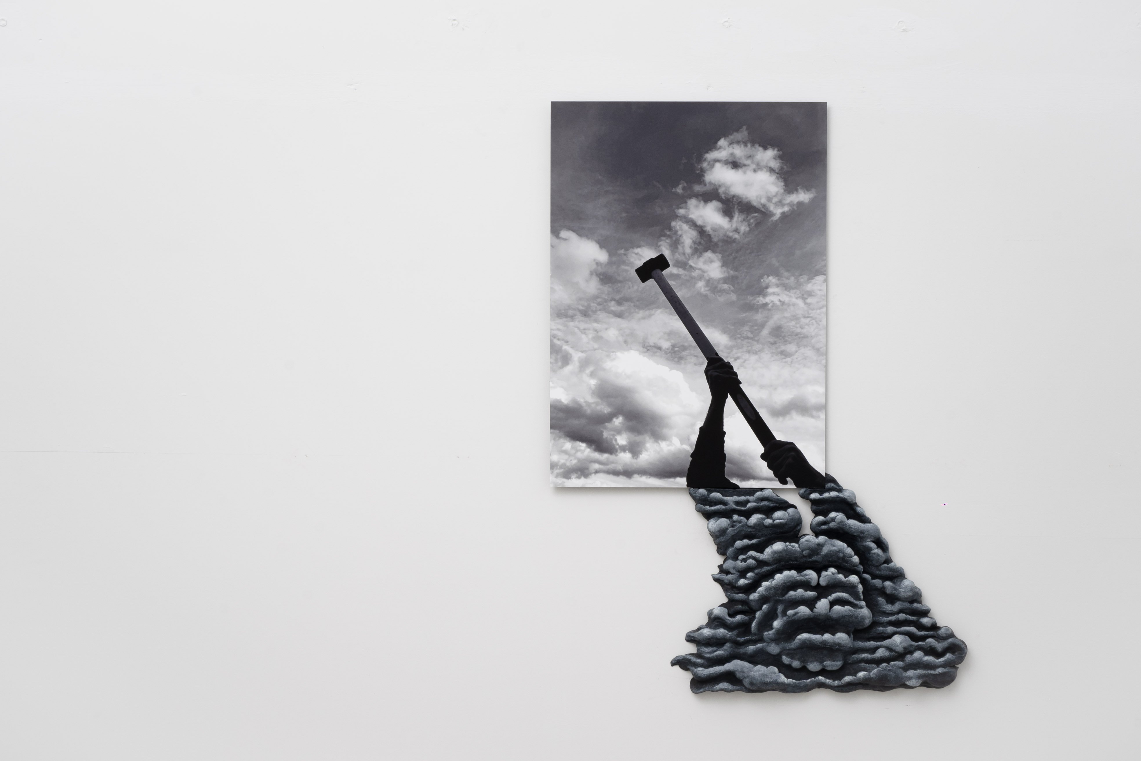 Uno scatto al cielo, alcune nubi scure sulla ditta edile dove di solito compro i materiali per le mie opere e dove cerco sempre di fermarmi a parlare con gli operai che ci lavorano, per raccogliere consigli e suggerimenti. Scattai questa foto mentre uno di loro agitava nel cielo una mazza, attrezzo usato sia per costruire che per demolire qualcosa, e durante quel gesto, accompagnato da un’espressione molto cupa in viso, il lavoratore mi disse: “Via via, vado a vedere se trovo le cinque!!”. Quell’espressione mi fece sorridere ma anche pensare. Riguardando la foto notai che il protagonista mancava, perché avevo fotografato solo le sue braccia. Per questo modellai accanto alla foto una nuvola antropomorfa in argilla, realizzata poi in bronzo patinato. Mi piaceva l’idea di riprodurre l’espressione di quel volto ombroso e minaccioso, pensando al dipinto di Giorgione “La tempesta”, o ai dipinti di Andrea Mantegna dove l’artista veneto ricreava con nuvole animate volti, paesaggi e autoritratti.