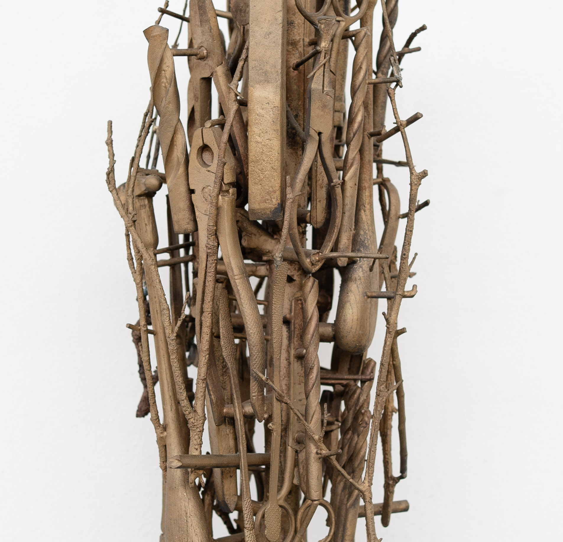Concordarsi per una pausa è una riflessione sul suono che sconfina oltre il tempo precostituito creandone un altro. Il suono come forma di meditazione, di ricerca e di cura. Si pensa che in alcuni popoli il suono abbia la funzione di curare lo stato d’animo, portando alla conoscenza del proprio io. Il suono emesso dai miei strumenti da lavoro, ascoltato in un altro momento assume un altro valore. Ho voluto ricreare quel suono sotto forma di scultura, rappresentando i miei strumenti in bronzo e assemblandoli in un’unica forma, montata su un motore elettrico rotatorio che, sfregando su piccoli perni di acciaio armonico, emette suoni. Nelle microfusioni, i piccoli oggetti in cera vengono montati su un pernio centrale, questo assemblaggio di elementi ricorda molto la forma degli alberi. Suono e “alberi di risonanza” (come gli abeti rossi che nascono tra il Friuli e il Trentino) chiamati anche “alberi che cantano” e da cui Antonio Stradivari prendeva il legno per realizzare i suoi strumenti. Nel 2018 la tempesta Vaia distrusse proprio in quella zona milioni di abeti rossi, dopo poche settimane il violoncellista Mario Brunello suonò appoggiando il proprio violino sul tronco di un albero, suonando non tra gli alberi ma insieme a loro: quell’albero suonò con lui.