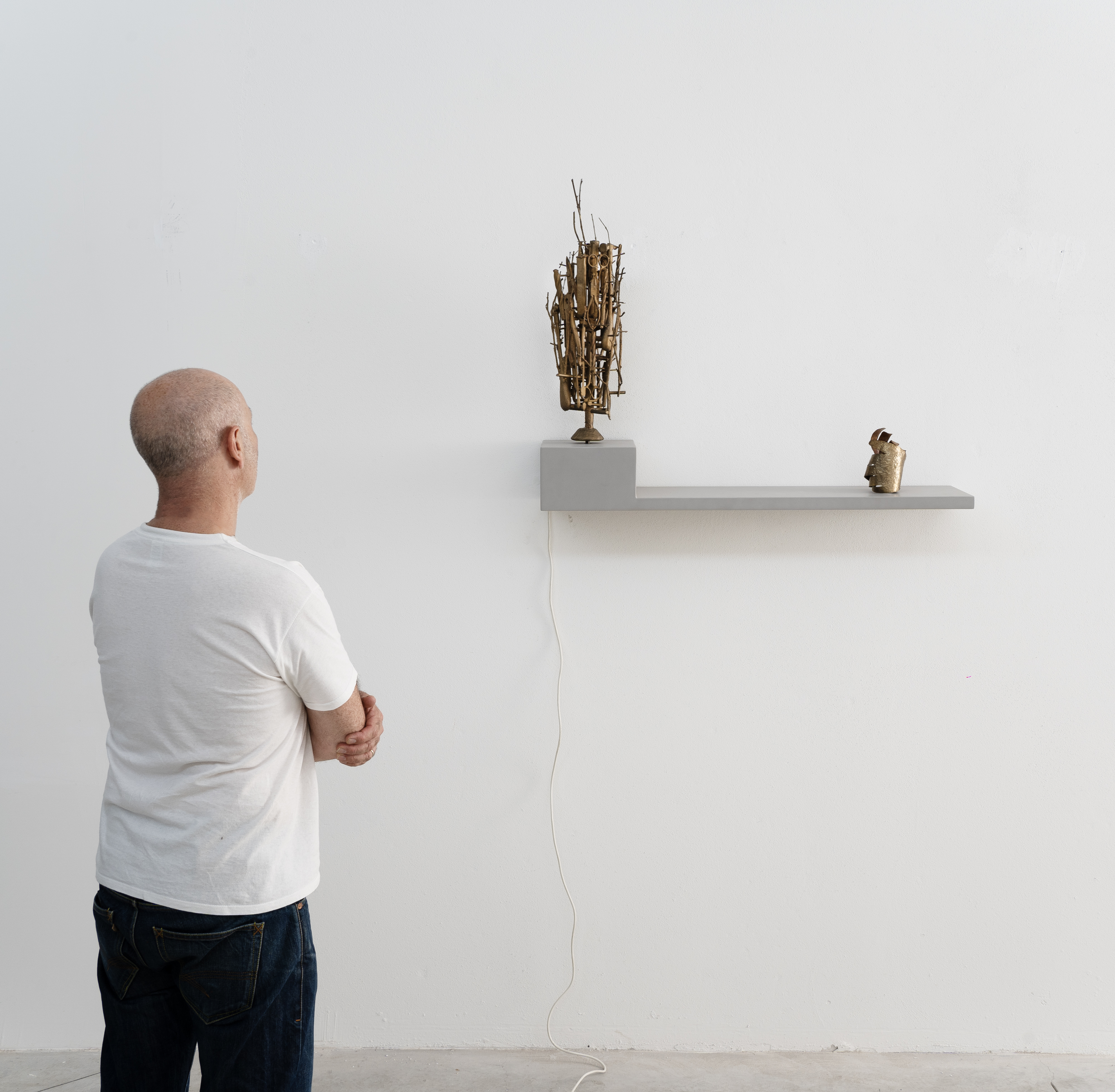 Marco Degl’Innocenti, CONCORDARSI PER UNA PAUSA, 2021. Bronzo 63x20cm, rame e bronzo 18x10cm, mensola in legno 100x25cm, motore elettrico. Foto e video dell’installazione di Veronica Citi. Link al video.
