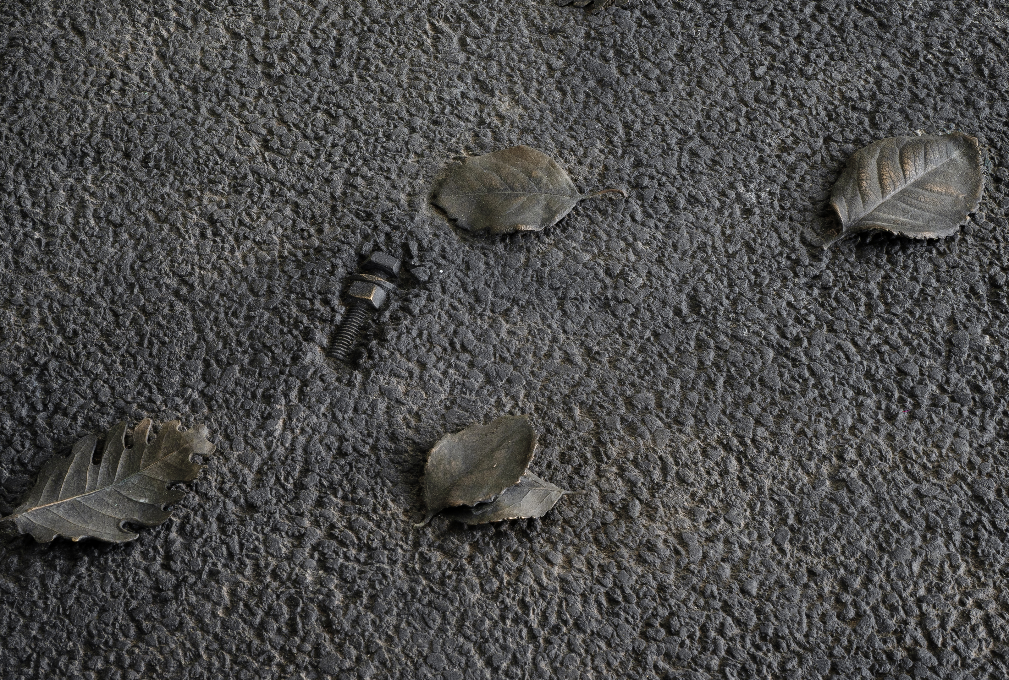 Questo lavoro, che ho intitolato 08:00-17:00, nasce da una fotografia scattata il Primo Maggio (festa dei lavoratori) del 2021. Mentre camminavo notai un bullone con dado imparentato con l’asfalto del manto stradale, mi piacque molto questa immagine e mi chiesi da quanto tempo quel bullone potesse essere lì, perché era evidente che il tempo aveva lavorato sia sul bullone, sia sul dado che sull’asfalto. Mi chiesi anche perché un bullone con dado fosse finito proprio lì! Poteva essere caduto a qualche operaio mentre lavorava alla nuova strada. Decisi poi di tornare a fare un’altra fotografia in un orario diverso, mentre il paesaggio intorno cambiava e nel frattempo si depositavano foglie portate dal vento e tracce di animali di passaggio. La prima foto è stata scattata alle 8 di mattina, la seconda alle 17, esattamente nell’orario di lavoro di un operaio. Decisi di trasformare queste foto in bassorilievo, partendo dal calco del manto stradale, con bullone e dado incastonato nell’asfalto, che erano rimasti lì ad aspettarmi…