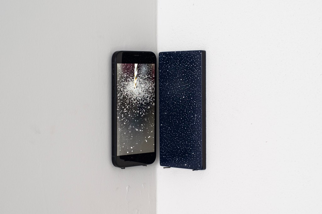 Marco Degl’Innocenti, RIFUGIO, 2023. Alluminio dipinto e inciso 15×17,5cm, video su telefono 15×17,5 cm. Foto e video dell’installazione di Veronica Citi Link al video